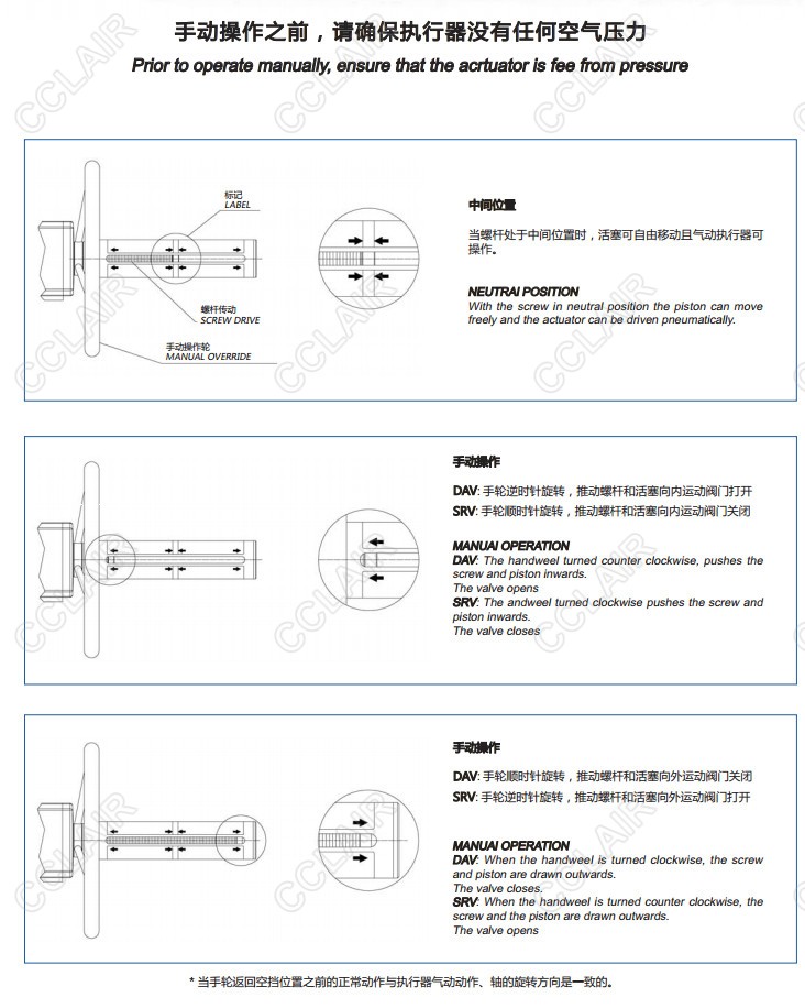為了保證氣動執(zhí)行器的正常工作,在對手動應急手動執(zhí)行任何操作之前必須將氣動執(zhí)行器的氣源斷開。