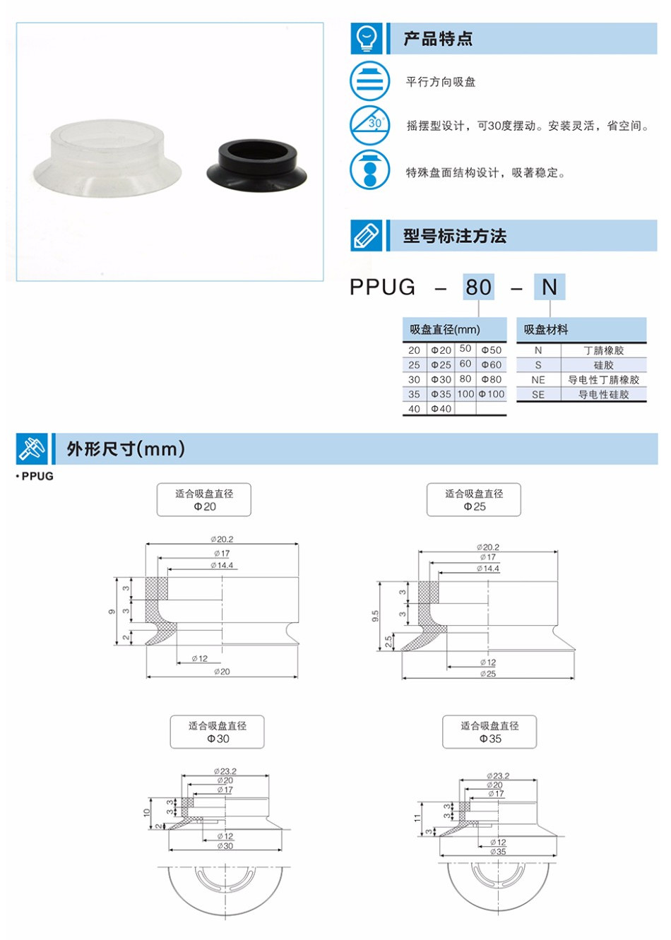 PPUG-20-N,PPUG-20-S,PPUG-20-NE,PPUG-20-SE,PPUG-25-N,PPUG系列搖擺型吸盤(pán)