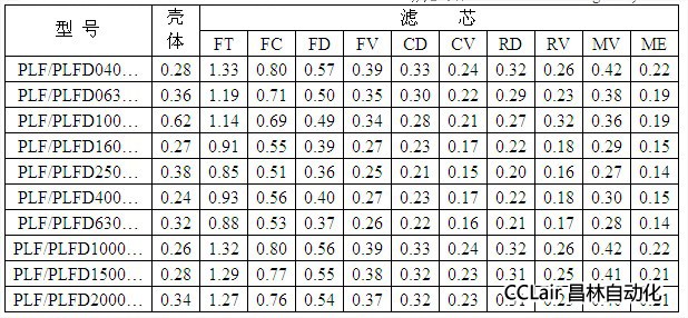 4、額定流量下的清潔濾芯壓降(單位:1×105Pa 介質(zhì)參數(shù):2/s 0.86kg/dm3)