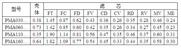 4 額定流量下的清潔濾芯壓降(單位:1×105Pa 介質參數(shù):30mm2/s 0.86kg/dm3)