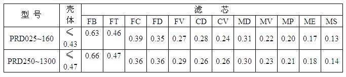 4 額定流量下的清潔濾芯壓降(單位:1×10 5Pa 介質參數(shù):30mm 2/s 0.86kg/dm 3)