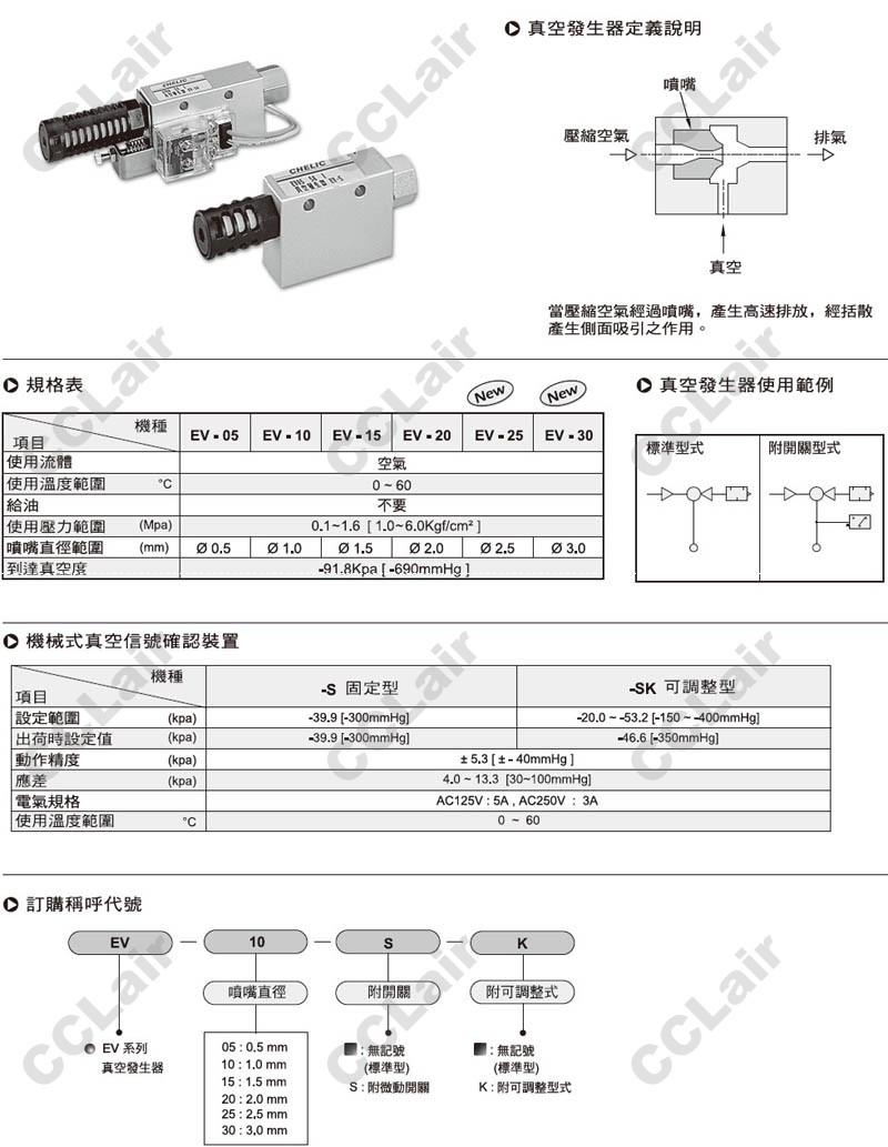氣立可(chelic),EV-05,EV-10,EV-15,EV-20,EV-25,EV-30,EV-05-S-K,EV-05-K,EV-10-K,真空發(fā)生器
