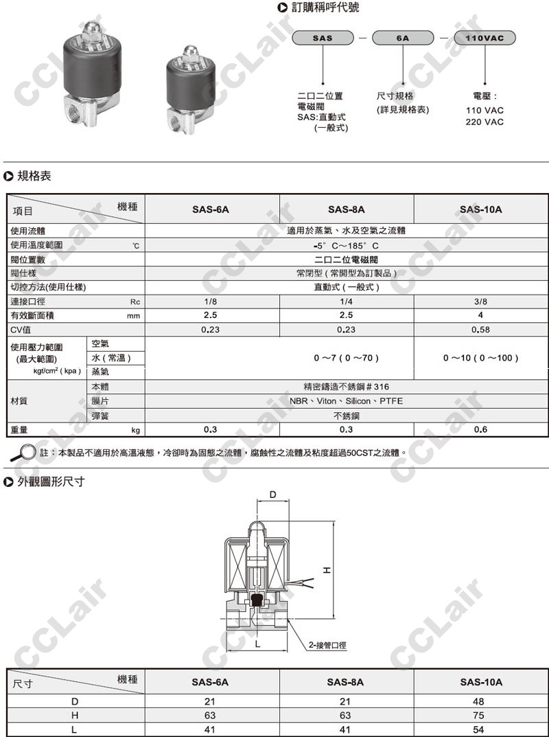 氣立可(chelic),SAS-6A-110VAC,SAS-8A-110VAC,SAS-10A-110VAC,SAS-6A-220VAC,電磁閥
