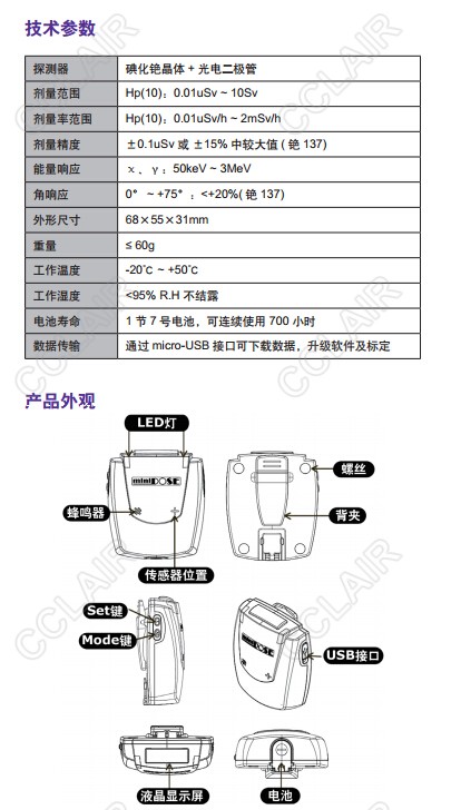 • 累計(jì)計(jì)量檢測范圍為0.01μSv 至10Sv