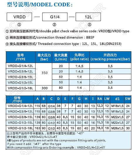 RDD-G1/4-12L,VRDD-G3/8-12L,VRDD-G3/8-15L,VRDD-G1/2-15L,VRDD-G1/2-18L,VRDD,雙向液壓鎖