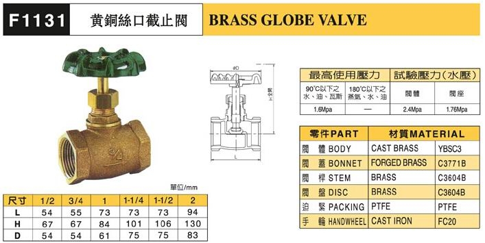 F1131黃銅絲口截止閥尺寸: