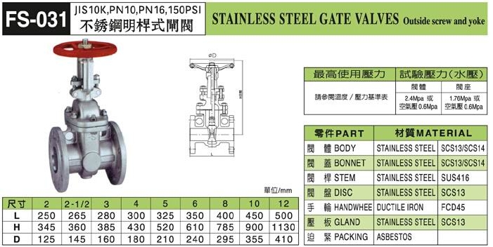 FS031不銹鋼明桿式閘閥可廣泛用于自來(lái)水,污水,建筑,石油,化工,食品,醫(yī)藥,輕紡,電力,船舶,冶金,能源系統(tǒng)等流體管線上作爲(wèi)調(diào)節(jié)和截流裝置使用。富山引進(jìn)歐洲高科技閥門(mén)制造技術(shù)所生産的彈性座封閘閥,利用閘門(mén)整體包膠産生變形補(bǔ)償作用達(dá)到良好的密封效果,克服了一般閘閥密封不良、漏水和生鏽的現(xiàn)象。