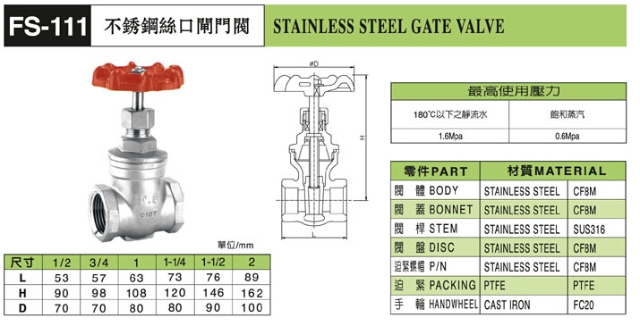 FS-111不銹鋼絲口閘閥硅溶膠鑄造閥體,工藝美觀,標(biāo)準(zhǔn)304材質(zhì),無銹斑,美國保險(xiǎn)業(yè)UL認(rèn)證。富山絲扣閘閥的啟閉件是塞形的閥瓣,密封面呈平面或錐面,閥瓣沿流體的中心線作直線運(yùn)動(dòng)。閥桿的運(yùn)動(dòng)形式,有升降桿式(閥桿升降,手輪不升降),也有升降旋轉(zhuǎn)桿式(手輪與閥桿一起旋轉(zhuǎn)升降,螺母設(shè)在閥體上)。紋管截止閥只適用于全開和全關(guān),不允許作調(diào)節(jié)和節(jié)流。
