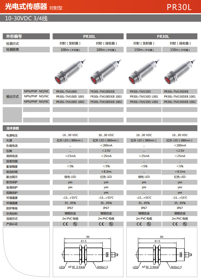 詳細信息 PR30L-TM100D,PR30L-TM100DEB,PR30L-TM150D,PR30L-TM150DEB,光電式傳感器