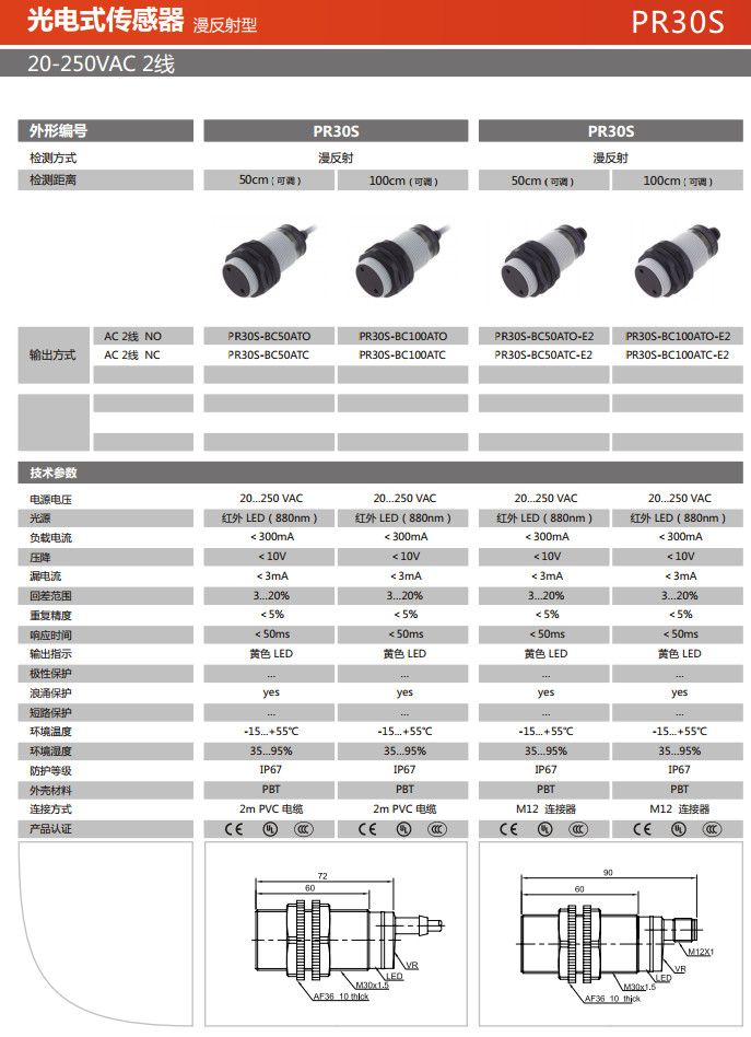 詳細(xì)信息 PR30S-BC50ATO,PR30S-BC50ATC,PR30S-BC50ATO-E2,PR30S-BC50ATC-E2,PR30S-BC100ATO,光電式傳感器