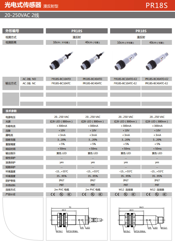 PR18S-BC10ATO,PR18S-BC10ATC,PR18S-BC40ATO,PR18S-BC40ATC,PR18S-BC10ATO-E2,光電式傳感器