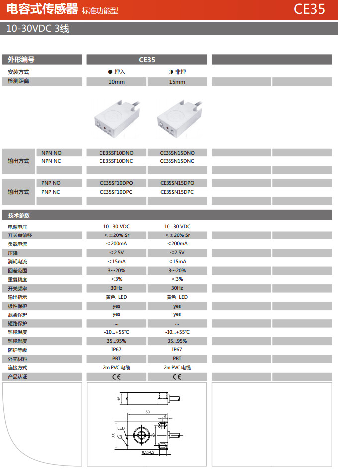 詳細信息 CE35SF10DNO,CE35SF10DNC,CE35SF10DPO,CE35SF10DPC,CE35SN15DNO,CE35SN15DNC,CE35SN15DPO,CE35SN15DPC,電容式傳感器