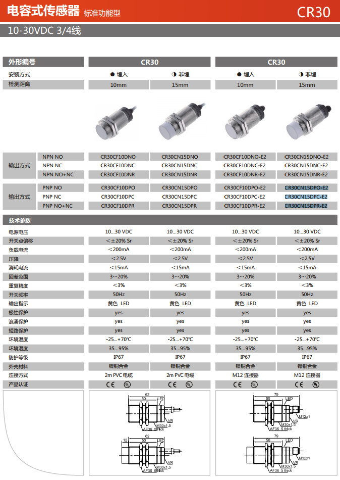 詳細信息 CR30CF10DNO,CR30CF10DNC,CR30CF10DNR,CR30CN15DNO,CR30CN15DNC,CR30CN15DNR,電容式傳感器