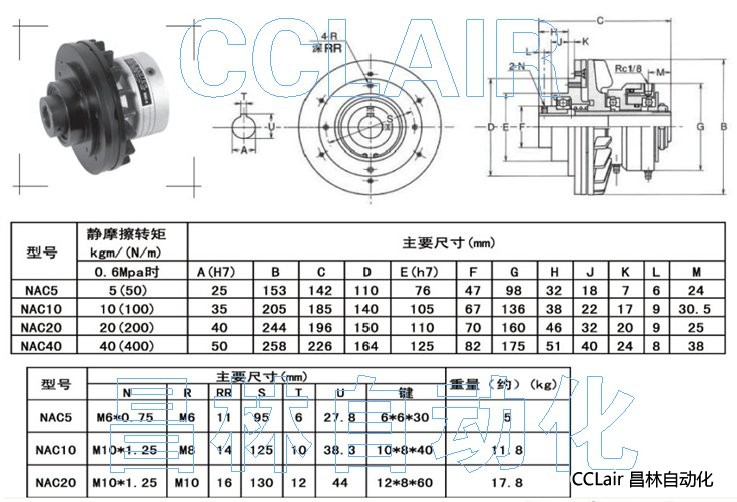 詳細(xì)信息 NAC6,NAC10,NAC20,NAC40,(標(biāo)準(zhǔn)型)空壓通軸式離合器