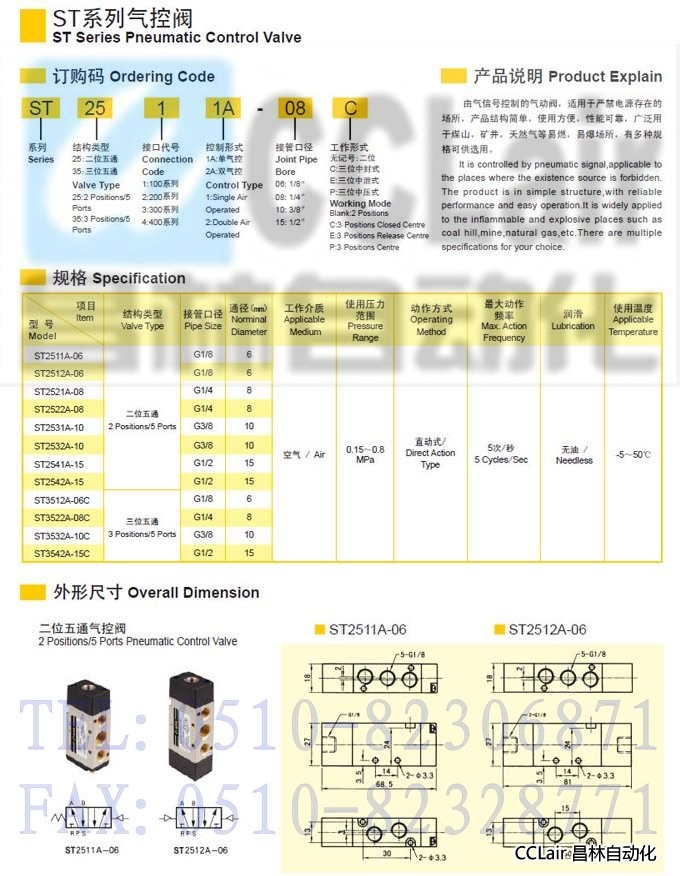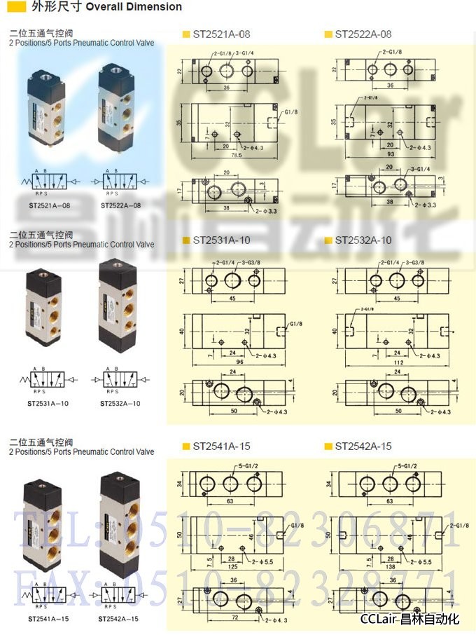 ST2511A-06,ST2512A-06,ST2521A-08,ST2522A-08,ST2531A-10,ST2532A-10,ST2541A-15,ST2542A-15,二位五通氣控閥