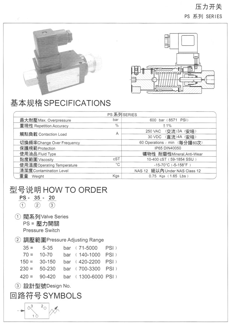 PS-35-20,PS-70-20,PS-150-20,PS-230-20,PS-420-20,壓力開關(guān)