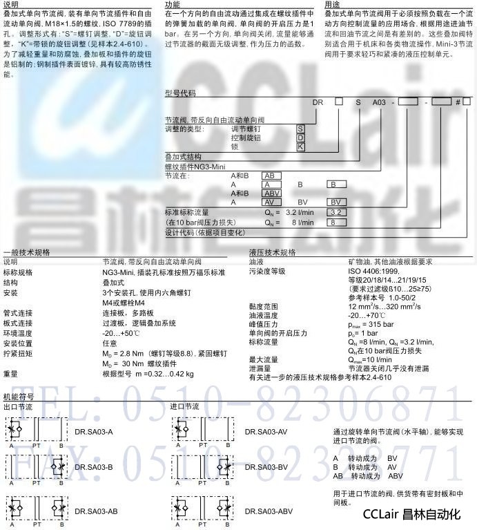 詳細信息 DR.SA03-A,DR.SA03-AB,DR.SA03-B,DR.SA03-AV,疊加式單向節(jié)流閥