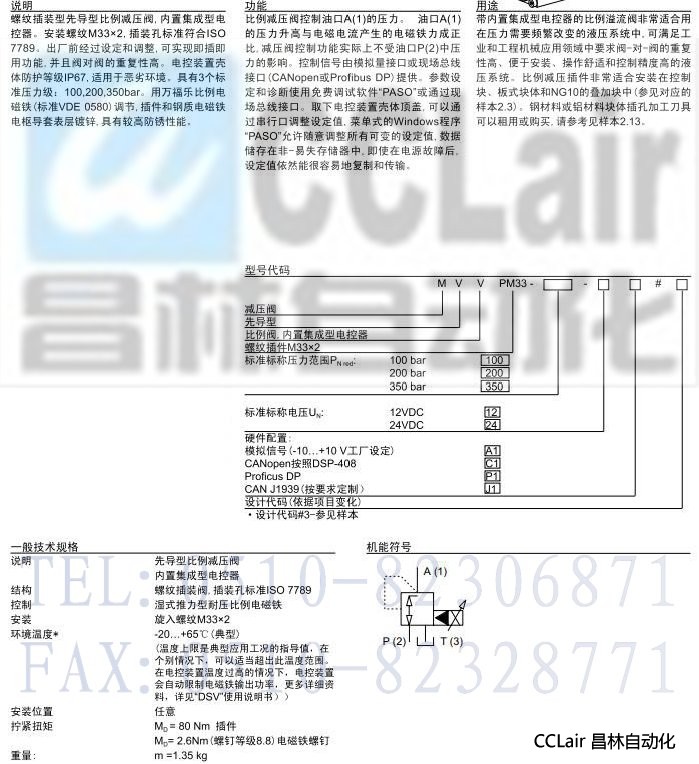 詳細(xì)信息 MVVPM33,先導(dǎo)式比例減壓插裝閥(內(nèi)置集成型電控器)