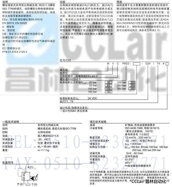 MVCPM22,防爆型先導(dǎo)式比例減壓插裝閥
