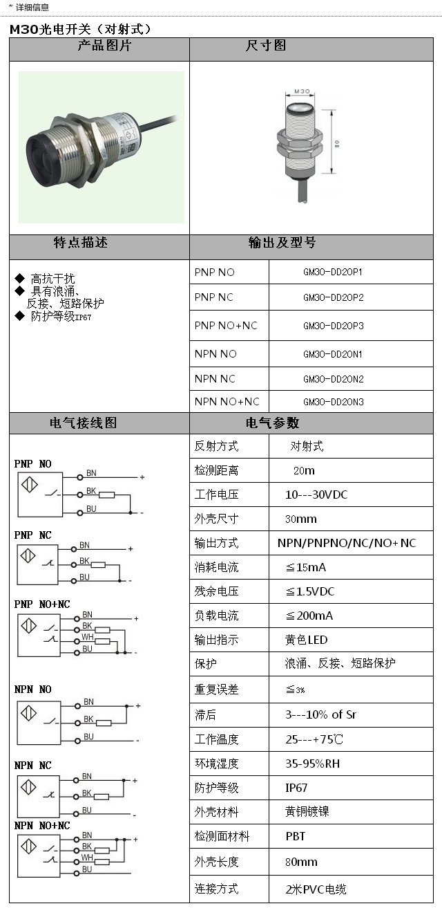 詳細信息 GM30-DD20P1,GM30-DD20P2,GM30-DD20P3,GM30-DD20N1,GM30-DD20N2,GM30-DD20N3,M30光電(對射)