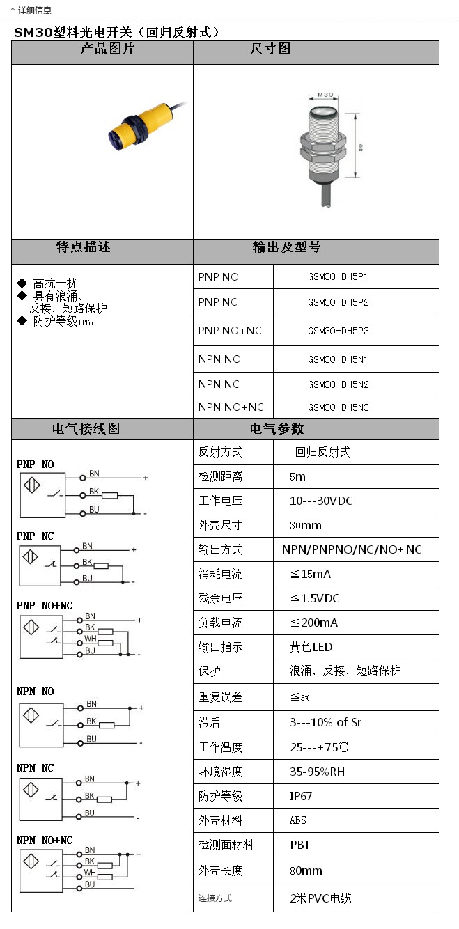 詳細(xì)信息 GSM30-DH5P1,GSM30-DH5P2,GSM30-DH5P3,GSM30-DH5N2,GSM30-DH5N3,SM30光電(回歸反射)