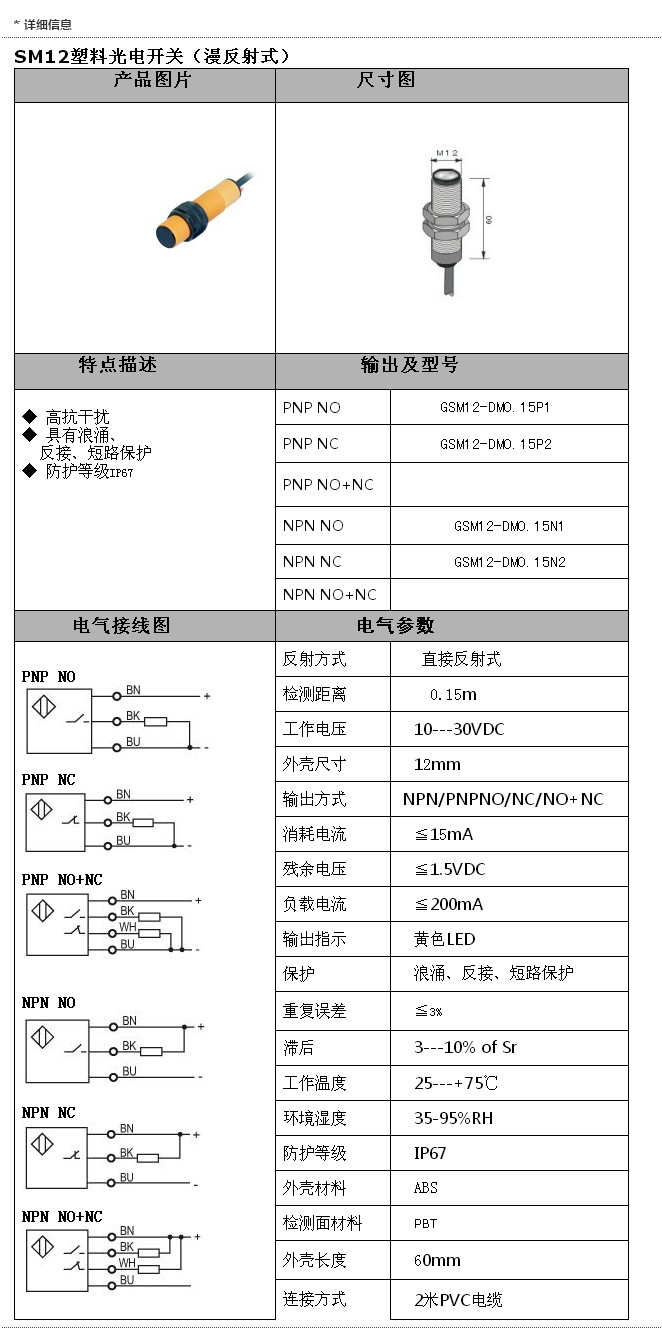 詳細(xì)信息 GSM12-DM0.15P1,GSM12-DM0.15P2,GSM12-DM0.15N1,GSM12-DM0.15N2,SM12光電(漫反射)