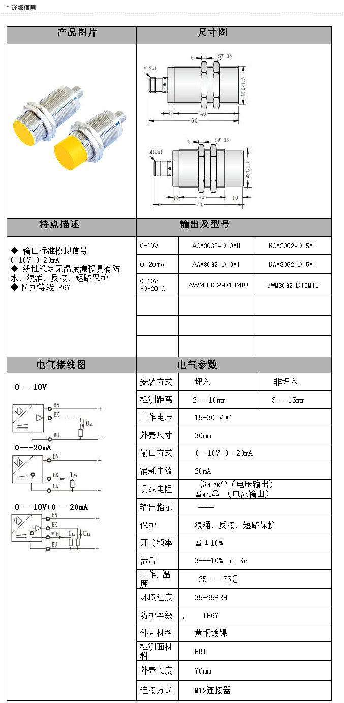 詳細信息 AWM30G2-D10MU,BWM30G2-D15MU,AWM30G2-D10MIU,BWM30G2-D15MIU,接插式M30模擬量傳感器