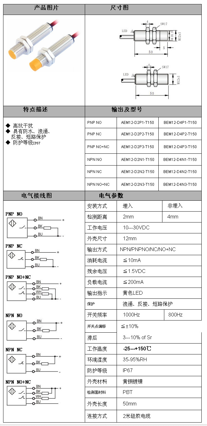 AEM12-D2P1-T150,BEM12-D4P2-T150,BEM12-D4N2-T150,BEM12-D4N3-T150,耐高溫M12接近開關(guān)