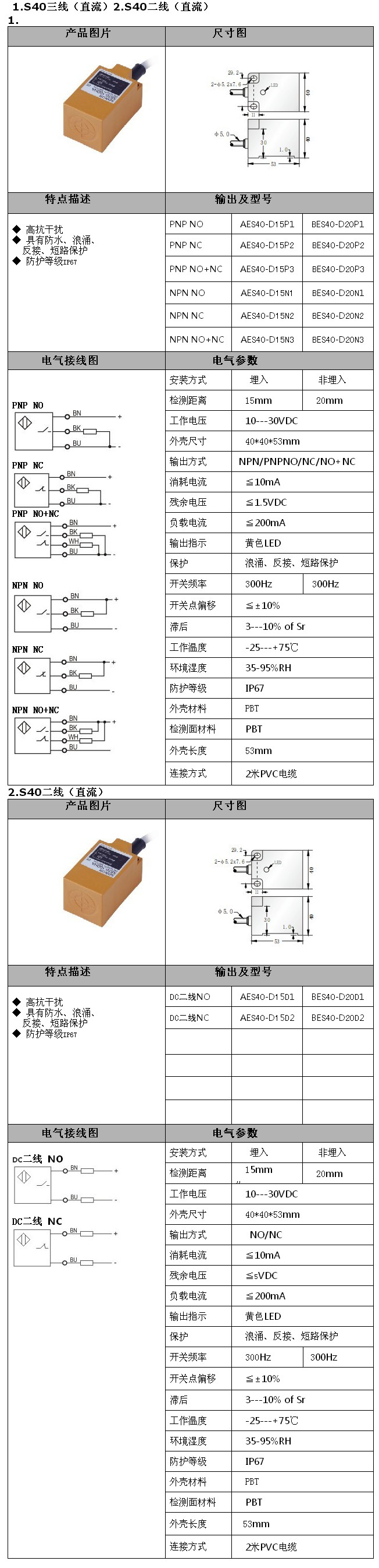 AES40-D15P1,BES40-D20P1,AES40-D15P2,BES40-D20N2,AES40-D15N3,BES40-D20D2,S40直流三二線接近開關