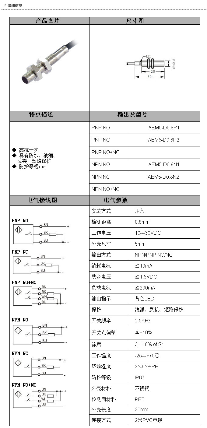 詳細信息 AEM5-D0.8P1,AEM5-D0.8P2,AEM5-D0.8N1,AEM5-D0.8N2,M5直流三線電感式接近開關(guān)