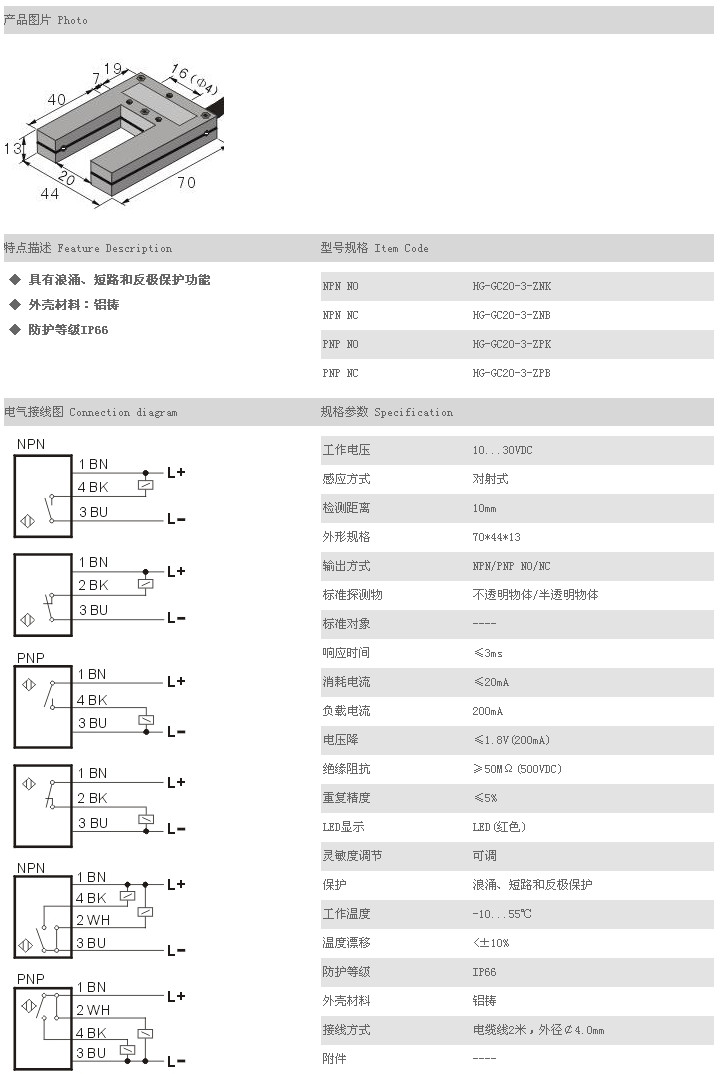 詳細信息 槽型光電開關/傳感器 HG-GC20-3-ZNK,HG-GC20-3-ZNB,HG-GC20-3-ZPK,HG-GC20-3-ZPB,