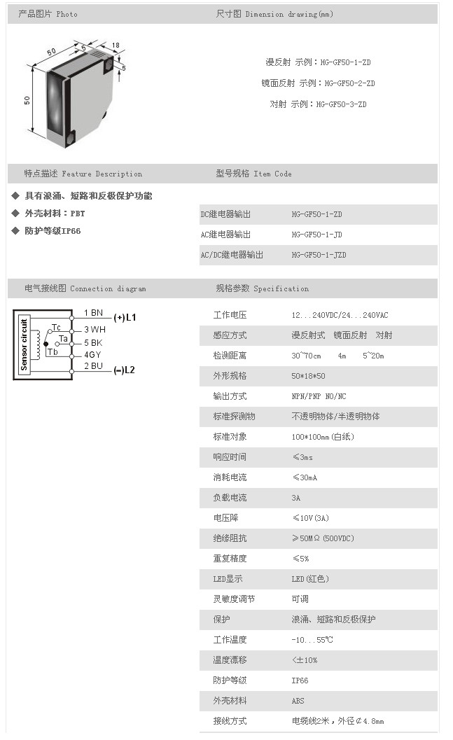 詳細信息 方型光電開關(guān)/傳感器 HG-GF50-1-ZD,HG-GF50-1-JD,HG-GF50-1-JZD,