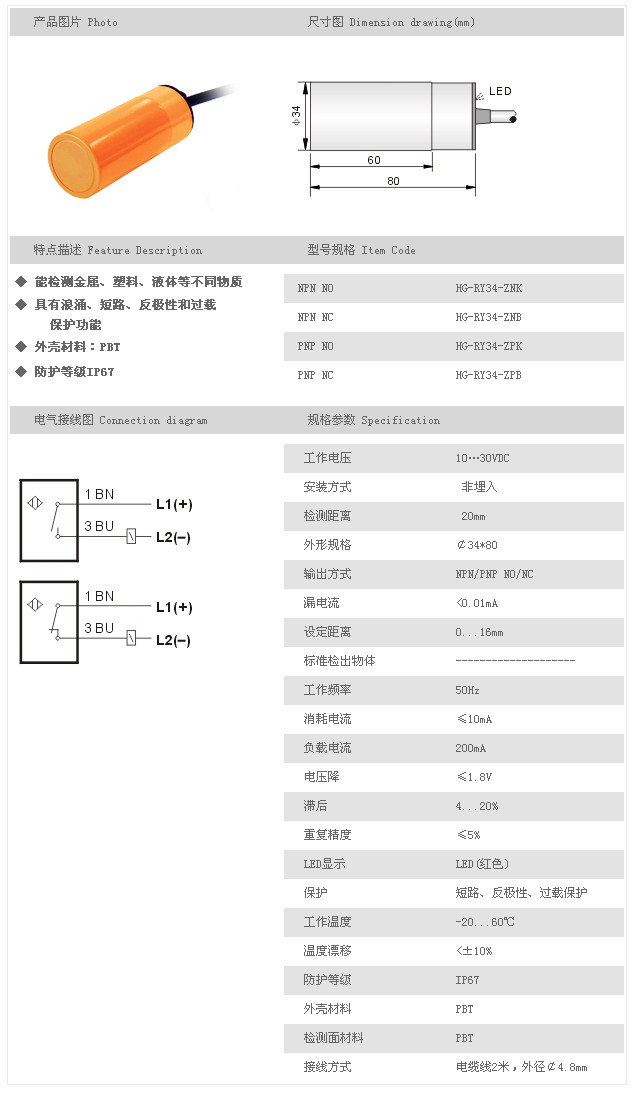 詳細(xì)信息 電容式接近傳感器 HG-RY34-ZNK,HG-RY34-ZNB,HG-RY34-ZPK,HG-RY34-ZPB,