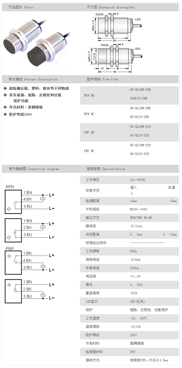 詳細(xì)信息 電容式接近傳感器 HG-RL30M-ZNK,HGRL30-ZNK,HG-RL30M-ZNB,HG-RL30-ZNB,HG-RL30M-ZPK,HG-RL30-ZPK,HG-RL30M-ZPB,HG-RL30-ZPB,