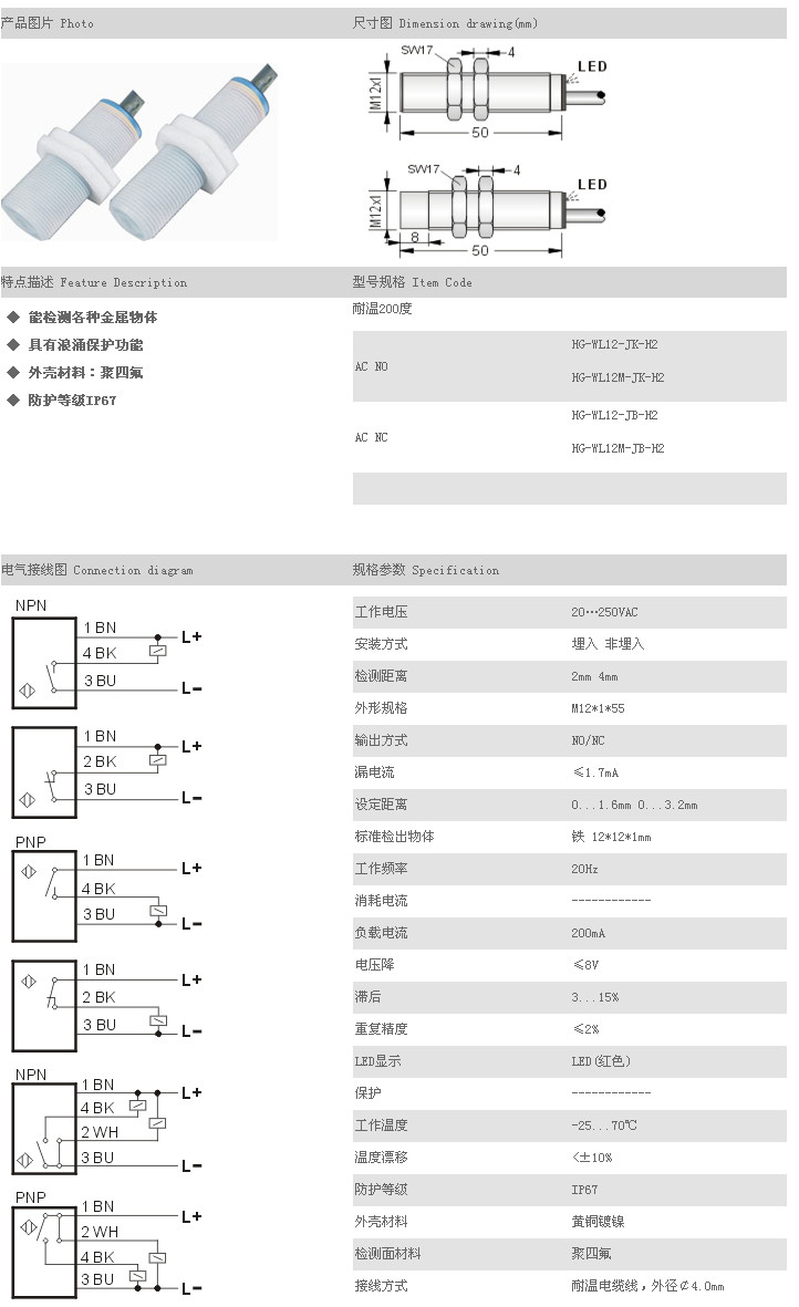 詳細(xì)信息 耐高溫接近開(kāi)關(guān)(低溫) HG-WL12-JK-H2,HG-WL12M-JK-H2,HG-WL12-JB-H2,HG-WL12M-JB-H2,