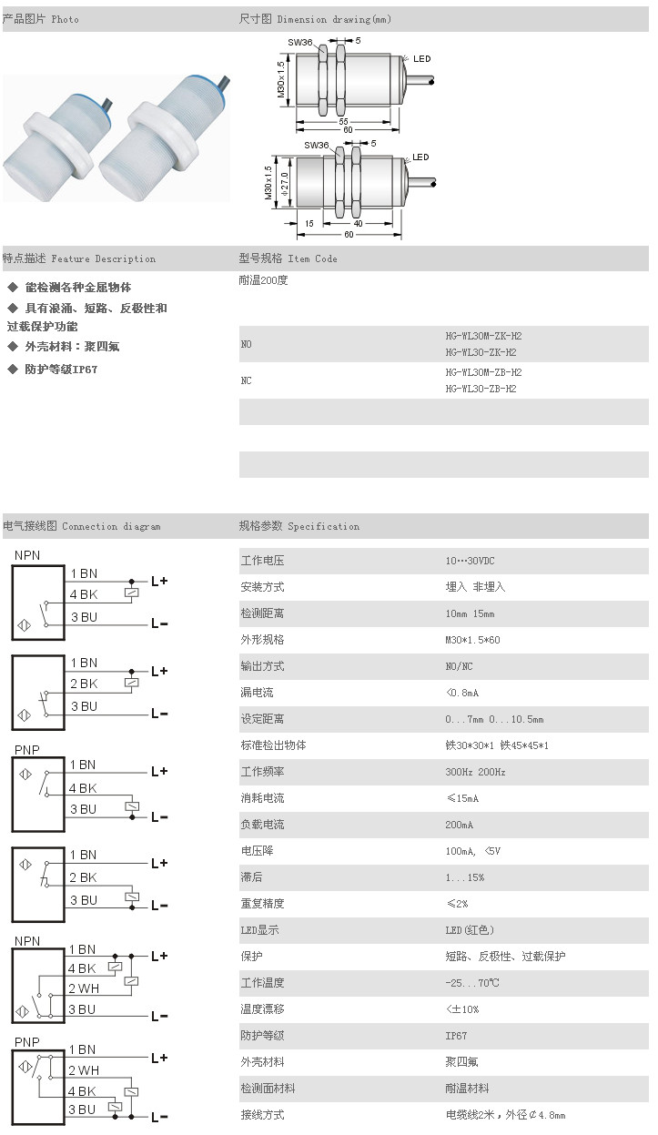 詳細信息 耐高溫接近開關(低溫) HG-WL30M-ZK-H2,HG-WL30-ZK-H2,HG-WL30M-ZB-H2,HG-WL30-ZB-H2,
