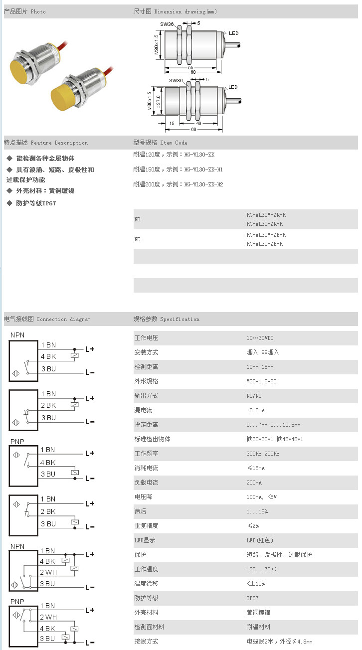 詳細(xì)信息 耐高溫接近開關(guān)(低溫) HG-WL30M-ZK-H,HG-WL30-ZK-H,HG-WL30M-ZB-H,HG-WL30-ZB-H,