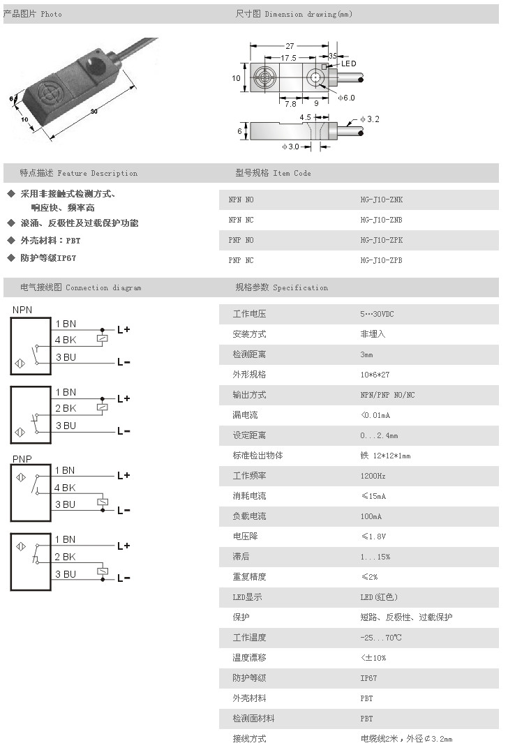 詳細信息 超小型接近開關(guān) HG-J10-ZNK,HG-J10-ZNB,HG-J10-ZPK,HG-J10-ZPB,