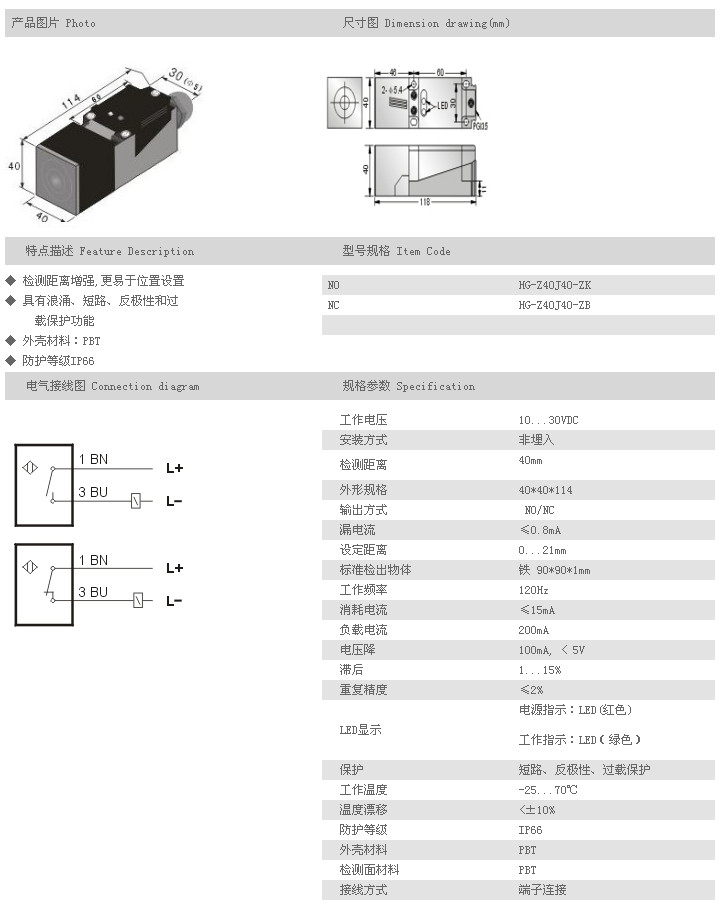 詳細(xì)信息 遠距離型接近開關(guān) HG-Z40J40-ZK,HG-Z40J40-ZB,