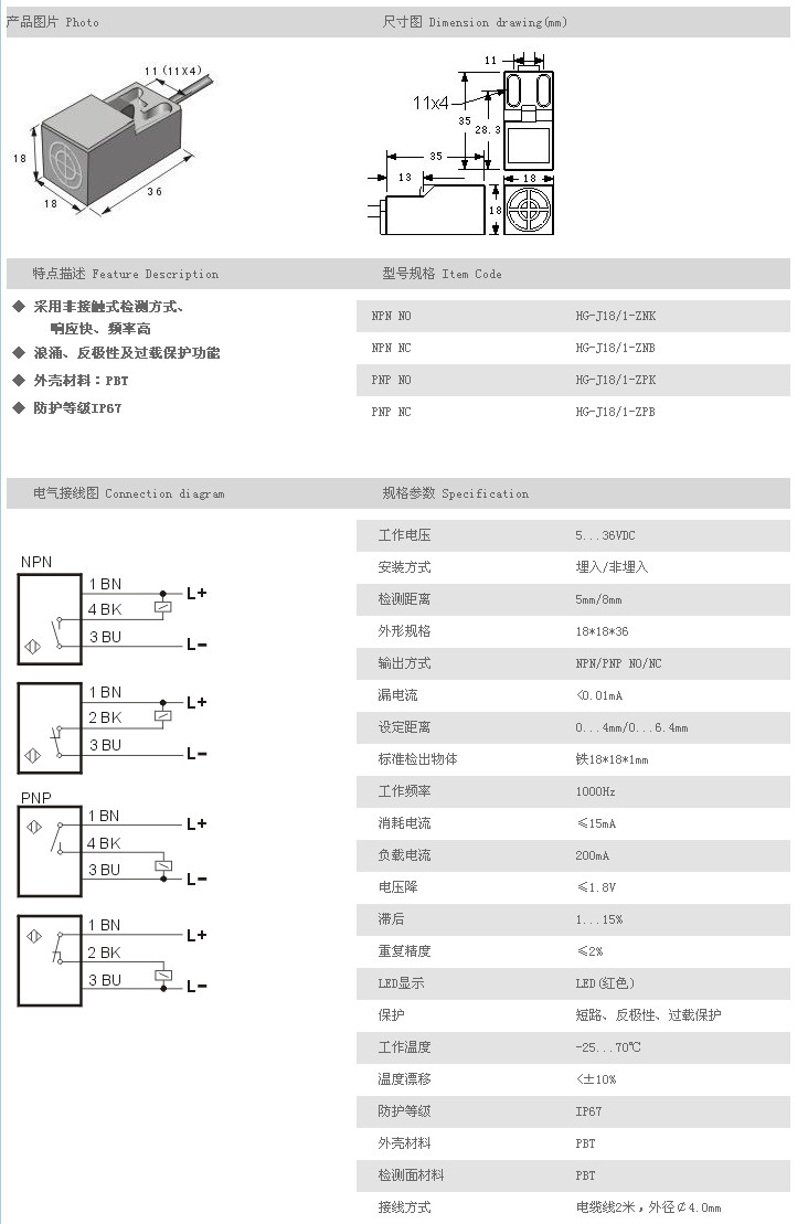 詳細(xì)信息 J18/1方型接近開(kāi)關(guān) HG-J18/1-ZNK,HG-J18/1-ZNB,HG-J18/1-ZPK,HG-J18/1-ZPB,
