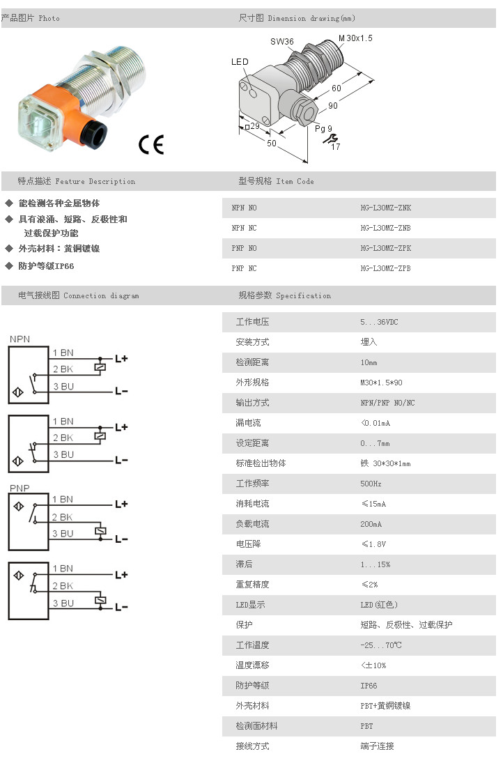 詳細(xì)信息 L30MZ圓柱型接近開關(guān) HG-L30MZ-ZNK,HG-L30MZ-ZNB,HG-L30MZ-ZPK,HG-L30MZ-ZPB,