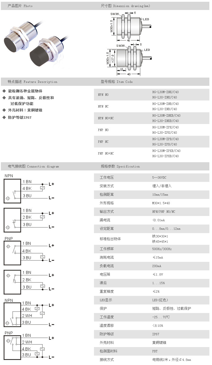 詳細(xì)信息 圓柱型接近開關(guān) HG-L30M-ZNK/C40,HG-L30-ZNK/C40,HG-L30M-ZNB/C40,HG-L30-ZNB/C40,