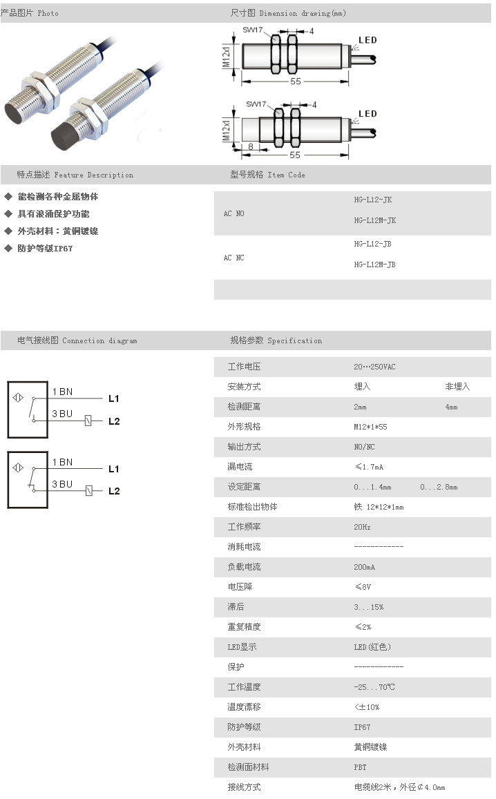 L12圓柱型接近開關(guān) HG-L12-JK,HG-L12M-JK,HG-L12-JB,HG-L12M-JB,