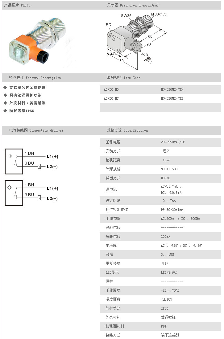 型號: L30MZ圓柱型接近開關(guān) HG-L30MZ-JZK,HG-L30MZ-JZB,
