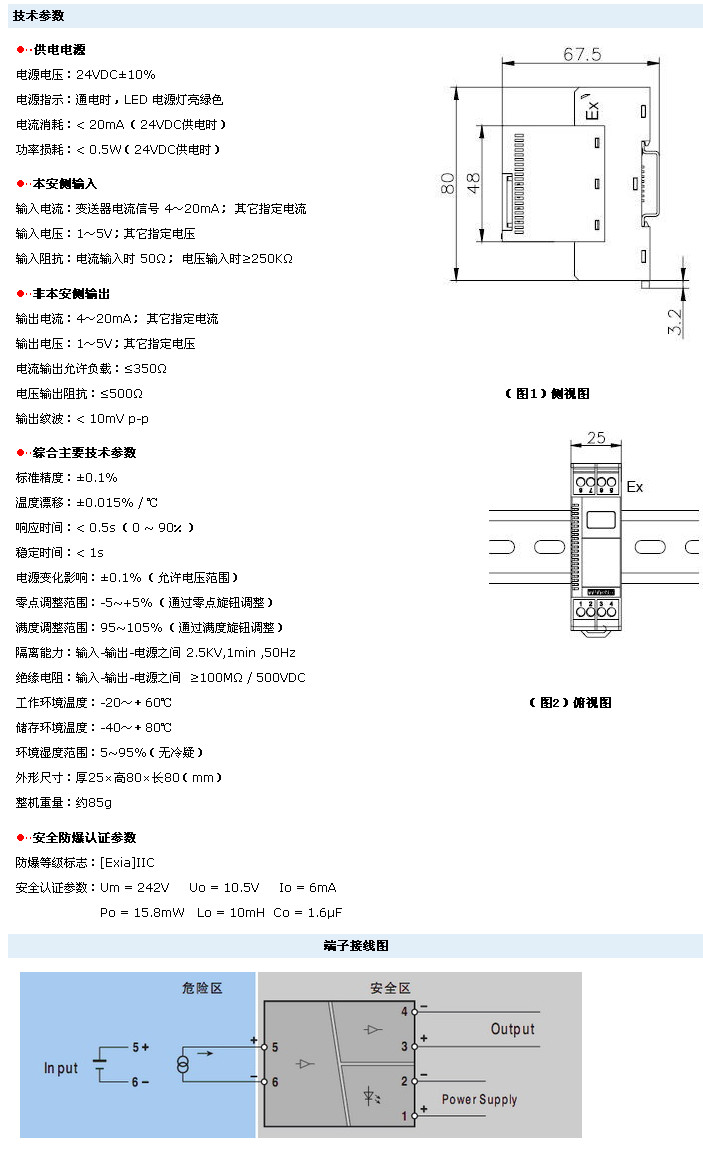 處于現(xiàn)場危險區(qū)域的各種設備的直流信號源,經(jīng)過安全柵隔離、抗干擾抑制等處理后。向安全區(qū)的控制系統(tǒng)或其它智能儀表輸出直流電流或電壓信號。