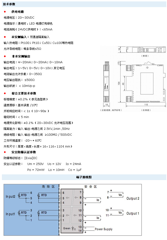 接收來自現(xiàn)場危險區(qū)域的熱電阻信號,經(jīng)過隔離和線性化處理,轉(zhuǎn)換為直流信號輸出至安全區(qū)的控制系統(tǒng)或其它單元組合儀表。