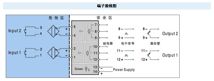 接收來自危險(xiǎn)區(qū)域的開關(guān)或接近開關(guān)信號(hào),通過安全柵隔離,以繼電器觸點(diǎn)(電平信號(hào)或晶體管)輸出方式傳送至安全區(qū)的控制系統(tǒng)或其它組合儀表。