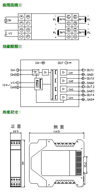 例:輸入4-20mA, 輸出4路信號(hào):4-20mA,供電24VDC