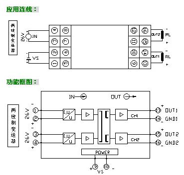l 雙通道隔離輸出,并對(duì)現(xiàn)場(chǎng)二線制變送器提供回路電源24V