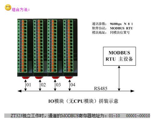 ZT323自帶一個(gè)RS485通訊口,內(nèi)部封裝了MODBUS協(xié)議,可以獨(dú)立工作,MODBUS從站地址等于從左向右排列的位置號(hào)。